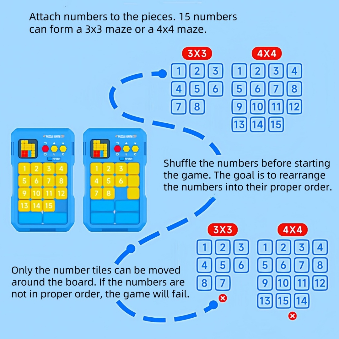 7.Number maze sorting(Klotski):Number stickers are included in the box. Apply the number stickers to the pieces and shuffle them. Players must move the pieces to restore the numbers to their original order to complete the game.