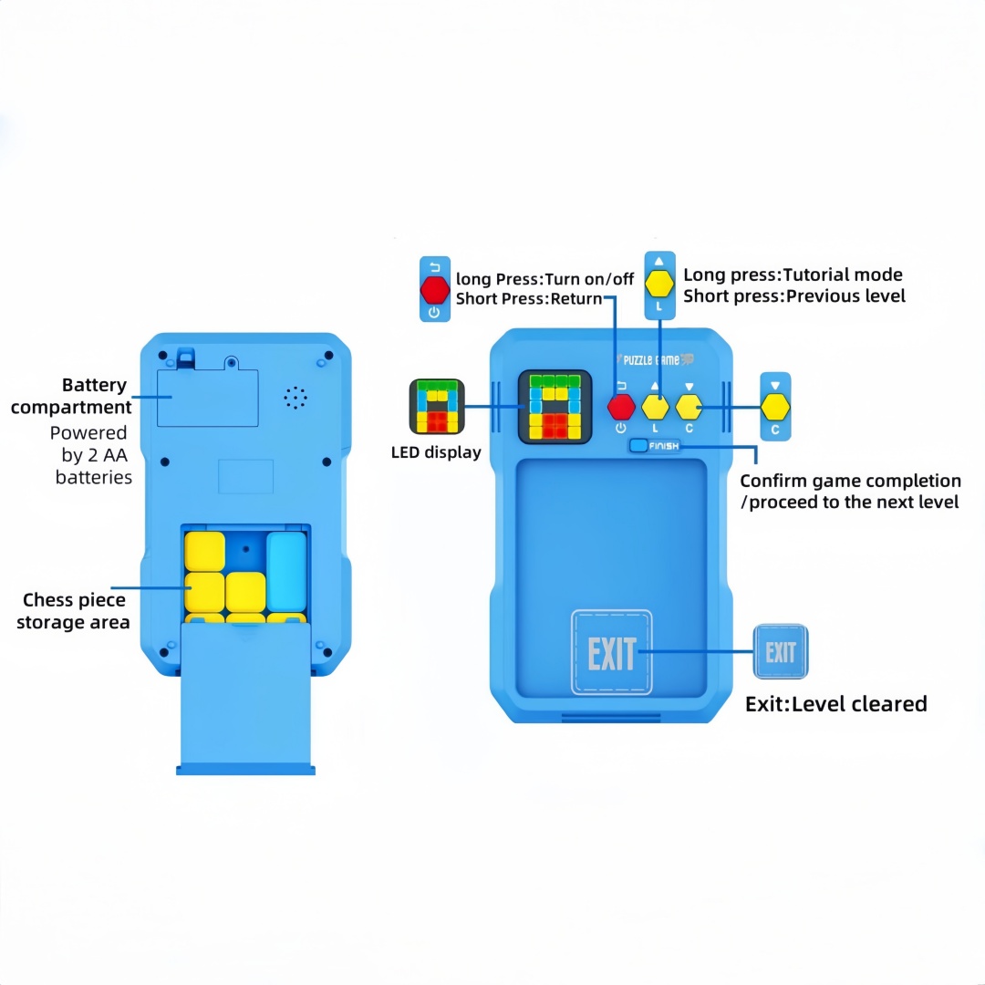 2. How to Play?After turning on the device, arrange the chess pieces according to the on-screen instructions. Each level will have two spaces for moving the pieces. Players must slide the large red piece from different positions on the board to the exit area at the bottom to complete the level. Press the "FINISH" button to complete the level and proceed to the next level. Movement rules: Only slide the pieces; removing them from the board is not allowed, The orientation of the blue long pieces cannot be changed.
