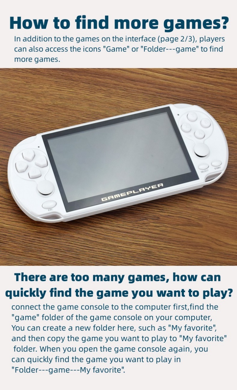 4.There are too many games, how can you quickly find the game you want to play?connect the game console to the computer first,find the "game" folder of the game console on your computer,You can create a new folder here, such as "My favorite", and then copy the game you want to play to "My favorite" folder. When you open the game console again, you can quickly find the game you want to play in "Folder---game---My favorite" in the game console.