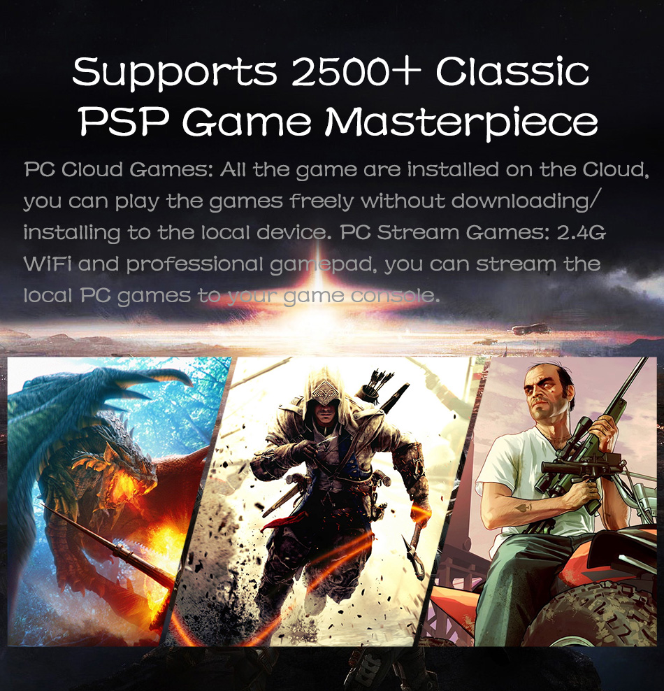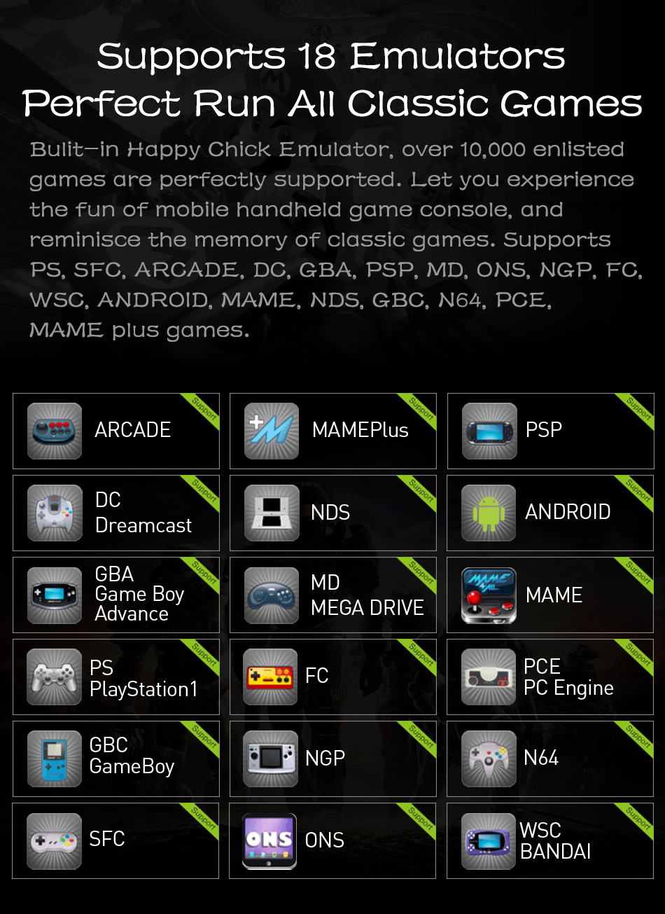 • Games Support:Android Games, PC Games, PSP Games,18 Simulators: PSP, NDS, DC, PS1, ONS, N64, CPS1\CPS2\CPS3, Neo-Geo, MAME,GBA,GBC,GB, SFC, FC, MD,SEGA,PCE,WSC,NPG,ONS......