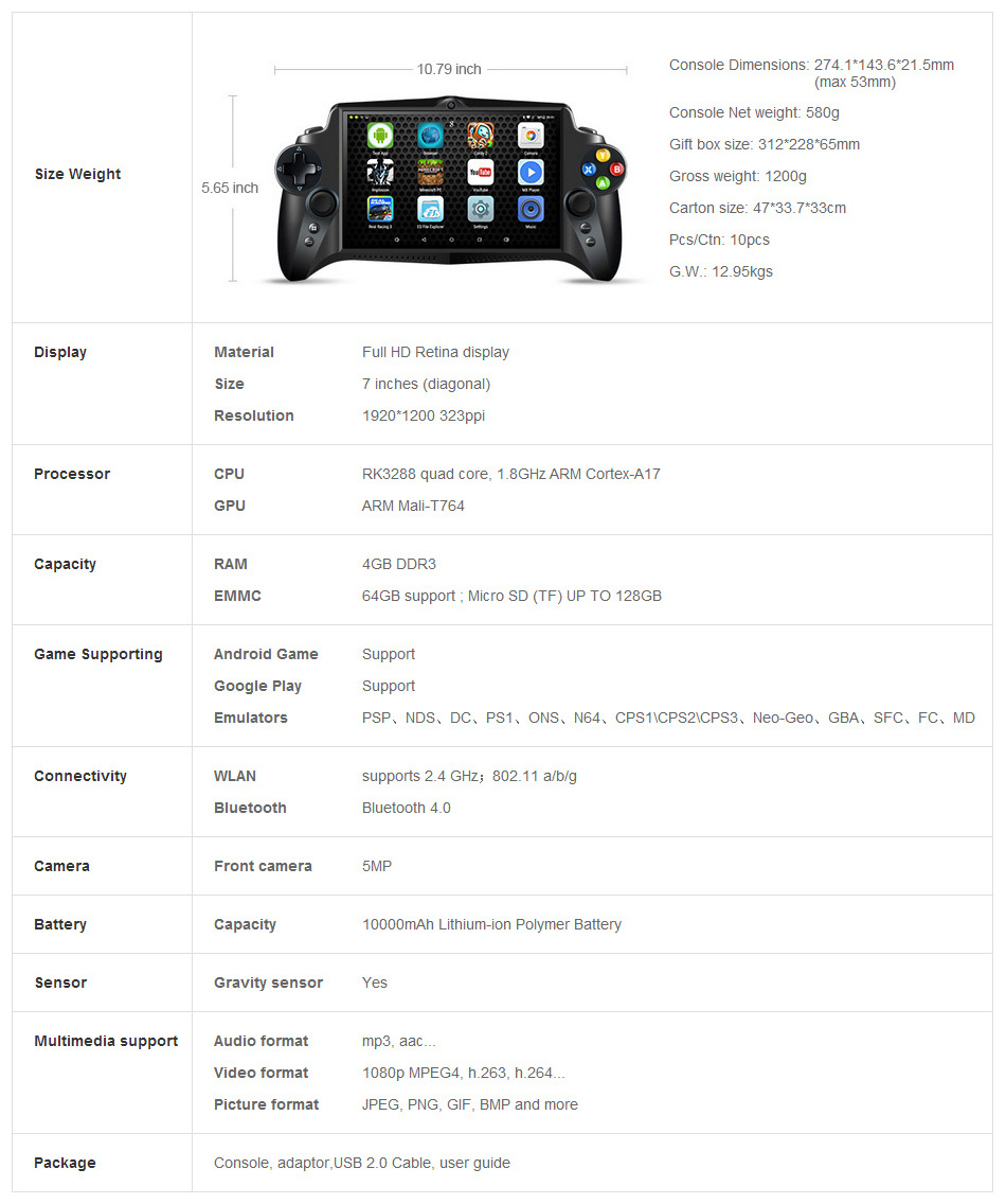 • Screen:Full HD Retina display IPS,7.0", 1920*1200 pixel,323ppi.
